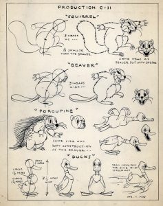 Beavers almost miss the boat in Disney’s major animal adventure, Father Noah’s Ark (UA, Silly Symphony, 4/8/33 – Wilfred Jackson, dir.). They are never seen involved in the initial construction process for the ark, nor in woodland group shots, not in the stampede racing for the ark, nor on the boarding gangplank. And they certainly didn’t tag along with the pair of skunks who make the voyage on the roof of the ship. Yet, somehow, they are seen in the third-to-last shot of the film, disembarking. The male and female beavers march down the gangplank, side by side, each one carrying a new youngster along on its tail. Guess they stayed busy on the trip, even if they missed being on the passenger list and traveled as stowaways.