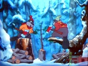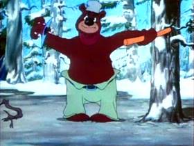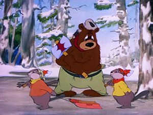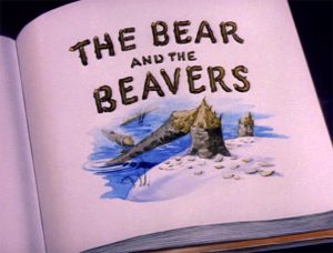 The Bear and the Beavers (MGM, Barney Bear, 3/28/42 – Rudolf Ising, dir.) – This picture is frameworked as if taking place within the illustrations of a children’s storybook, much in the same manner as Disney would later framework “Winnie the Pooh”, but without some of the page-turning and type-moving gimmicks. We are told by its pages that Barney (still apparently a nameless bear at the time of release) has gotten tired of living in cold, damp caves and old hollow trees, so has adopted human homebuilding style, constructing himself a sturdy log cabin with massive stone fireplace and chimney (a sign outside names the cabin the “Snuggly-Wuggly”). Barney sits in a plush easy chair padded with multiple pillows, dressed in a warm robe, loading logs into his fireplace only inches-distanced from his reach, and basking in the warmth and comfort. Life might be ideal, but one day he runs out of firewood. He enters the forest, wearing scarf and hat, and armed with an axe and a large box for his wood. We don’t know how Barney got his original supply of big and little logs to build his cabin and stoke his fires, but all indications are that Barney cannot claim the title of an experienced woodsman. He wrestles with an axe head with a talent for coming loose from its handle. It first causes Barney to swing at the tree with no blade, sending a wave of vibrations through his arms and up his entire torso upon impact. Replacing the blade on the handle, Barney swings again, flipping the axe head loose into the air, where it twirls like a Frisbee, and returns for circling passes at Barney’s face again and again like a boomerang. After repeatedly ducking out of its way, Barney stands erect, and extends out his arm with the axe handle, timing things perfectly to catch the whirling blade back upon the handle on the next pass. He finally gets a swing at the tall pine which has been his target. But now the tree gets the vibration shivers just as Barney experienced before, shaking down an avalanche of snow nestled in the tree’s upper branches, right on Barney.