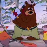 That night, Barney returns to what will be the scene of – the crime, armed with boxes galore. Displayed as still illustrations within the book pages, Barney “borrows” some wood. The next page displays him loaded – for bear, so to speak, adding the words, “Quite a bit.” The next page shows the beavers’ warehouse, empty, with the additional words, “In fact, all of it.” The theft of the century. However, Barney is as inept in covering his traces as he is as a woodsman. An elderly beaver with a walking cane, who acts as night watchman for the community, passes the warehouse on his rounds – and does a delayed double-take upon discovering the place laid “bear”. He races to a square in the center of the village, and rings a triangle to sound a community alarm, rousing all the other beavers from their dens, in a scene likely inspired by the “Giant on the beach” alarm sounded by Gabby in Fleischer’s “Gulliver’s Travels.” It’s not hard to find the path of the culprit, as the watchman points the community’s eyes to a long trail of huge bear pawprints left in the fallen snow. The trail ends obviously at the doorstep of Barney’s cabin. Inside Barney now basks in the heat of a monster blaze in the fireplace, stoked by a lumber pile at his sides reaching all the way to the ceiling. What’s more, embers and plumes of smoke pour out the chimney top, almost as visible as a rocket’s exhaust, making it elementary to determine from outside where the community woodpile is currently located.