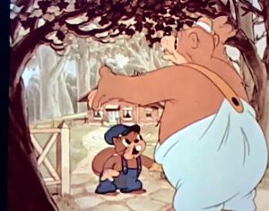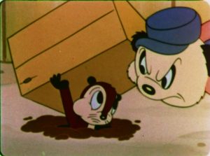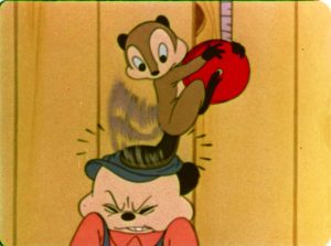 The House That Jack Built (Screen Gems/Columbia, Color Rhapsody, 4/14/39 – Sid Marcus, dir.) seems to have the distinction of featuring the first beaver character to have a name. The studio isn’t taking any chances as to the audience missing the point that Jack the Beaver is industrious – dressing him in the same worker’s hat and coveralls as Practical Pig, and even giving him a modification of the same voice (provided once again by Pinto Colvig, who also voies an ostrich featured in the story). Jack carries a box of tools and an armload of lumber through the forest to a vacant lot site. On the way, he is accosted by a bear panhandler. “Can you spare a dime for a cup of coffee?”, the bear asks in the standard sympathy ruse. Jack answers with a response I wish I’d turned on some panhandler, guaranteed to kerflummox their true intentions. “I haven’t got a dime…but here’s a cup of coffee.” The bear stares bewildered at the steaming cup handed to him as Jack continues on, and barely has the presence of mind to sip down the brew before tossing the cup away and continuing to pursue Jack. “What’cha doin’?”, asks the bear, seeing jack using a shovel to break ground. “Building a house”, replies Jack. The lazy bear immediately plops himself on his back onto the ground, and proposes. “Build one around me, buddy. I’m sick of the outdoors.” Jack gets as steamed as his coffee, and smacks the bear across the tummy with his shovel, forcing him to retreat a distance behind a tree. Jack begins to lecture in song about his work ethic, as Practical Pig was also prone to do, in a talk-sung number entitled, “You Don’t Get Nothin Doin’ Nothin’”. Bu the time the song is through, we have cross-dissolved our way to the home’s completion. (Being a beaver, Jack prefers lumber to Practical’s bricks.) The bear turns up right on cue, complementing how beautiful the house is, and proposing to an equally-shiftless ostrich pal of his that they should have a house warming. Jack immediately senses trouble, but can’t keep the two buttinskies from forcing their way through the front door, then locking Jack out behind them.