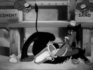Construction commences on adjoining lots, at the firing of a starter’s gun. Porky directs an all-species roster of animal workers, while Diggs’s crew seems to consist entirely of humanized dogs. Things begin pretty evenly matched. One character on Porky’s team will be familiar to long-time Warner viewers who may never have seen this picture – a meandering little dog better known for his recurring walk-ons in “Porky the Fireman”, with a signature walking tune. Here, he follows an electrical wire from a stash of dynamite ready to blast, over to the plunger detonator. A crowd of spectators huddles around him. He orders them back, telling them to “Stand back, folks, ya bother me.” But they keep pushing back in to the same proximity before the plunger can be pushed. Finally, the dog abandons the detonator, and travels over to the wire’s other end, pretending to inspect the explosives. The people follow him, huddling around the dynamite. The dog slips through the crowd between someone’s legs, returns to the plunger, and pushes it down, exploding away the intrusive crowd. A hod carrier scales the side of an erected girder with plumber’s helpers tied to his shoes. Dirty Diggs begins to engage in dirty tricks, and tosses a brick at him. The worker falls to the ground, but the two plungers continue scaling the girder on their own to the top. We finally get some beaver activity, as two beavers from Porky’s crew mix respective vats of sand and water with their tails, then flip scoops of their ingredients into a large container fastened between the humps of a camel. The camel shakes the concoction with movements of his humps as if mixing a drink, then pours out the completed cement into the inverted shells of a continuous line of turtles. They deliver the cement to a dispenser for aerial delivery by pelicans. Diggs plays dirty again, sending up a fish tied to the string of a toy balloon. The pelican takes the bait, spilling his cement load onto Porky below.