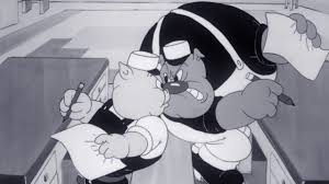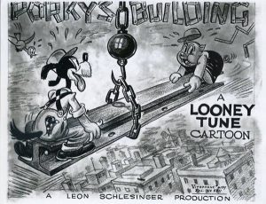 Porky’s Building (Warner, Porky Pig, 6/19/37 – Frank Tash[lin], dir.) is a fun 1930’s style animal romp – even if Porky doesn’t seem to be entirely the center of the cartoon’s activity. It begins with a rarely seen Foreward: “Any similarity of characters or happenings in this picture to actual people or events is definitely intended – If you think we’re going to sit around for days thinking up new ideas, you’re pixilated!” Porky, and a canine known as Dirty Diggs, are the town’s only construction contractors, and fierce rivals. They are each asked to submit a bid on building the town’s new City Hall according to pre-approved plans. (The plans guarantee the structure to be a politician’s paradise, with hot air outlets.) The two construction whizzes seat themselves at opposite desks in the office of commissioner Sandy C. Ment, and begin number-crunching to make the lowest bid (with a few attempts to sneak views of the other’s paper over the shoulder). Facing each other nose to nose, they hand in their bids simultaneously. According to the Commissioner, the bid amounts are identical! (However, Diggs’s paper actually displays a comma where a decimal point should be before the digits for pennies – so, shouldn’t Porky have won in the first place?) How to settle the matter? Of course – a competition. Each one tries to build a building. First one completed gets paid. (Such a deal! So the loser eats the $3,000,000.02 in construction costs? And who gets the second uncompleted building?)