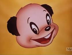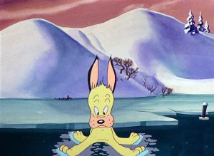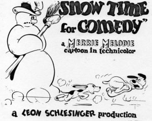 Snowtime for Comedy (Warner, Merrie Melodies, 8/30/41 – Charles M. (Chuck) Jones, dir.) – Jones’s “two curious puppies” are in another of their battles for a bone – this time set against the icy backdrops of a frozen winter. Both dogs and the bone take a slide down a massive ski-jump, the bone in the lead. The little pup overshoots it, sliding out onto the banks of a not-yet frozen lake. He breaks off a small floe of ice from the banks before reaching the water, then sails out into the middle of the lake, helplessly trapped aboard the small floating chunk of ice. The larger dog also overshoots the bone, but avoids falling into the lake, negotiating a course adjustment in his slide that bowls him right into a small beaver dam just constructed (with the accompanying sounds of a bowling ball scoring a strike on a full lane of pins). The dog is next seen, still sliding, but with the dam’s logs piled atop him in the shape of an Indian teepee. Eventually, he sheds the lumber, only to slide into a snowbank, then collide below the snow surface into the trunk of a half-covered tree.