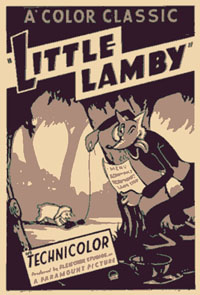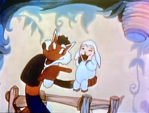 The fox posts a notice in the public square, announcing a Baby Contest, with big prize to the prettiest and healthiest baby (must be kind and tender). All the village takes notice, including a parent beaver carrying his youngster along, riding upon his tail. Soon, everyone is gussying-up their offspring as the logical choice for the prize, while the fox dons a fake beard and constructs a judge’s stand. The entrants parade past him in review, yet there is no sign of the beavers either in the preparation or in the contest. In fact, the beavers do not appear to have even entered, as they are not represented on a cross-off list the fox carries of rejects for his main course, ruling out squirrel on toast, roast duck, and fried rabbit. The lamb finally arrives, and is happily inspected by the fox for its plumpness. “The winner – and, my dinner!” shouts the fox, casting away his fake beard, dropping through the judge’s stand by way of a trap door, and exiting in a hurry upon a hidden motorcycle concealed beneath the stand, with the baby lamb clasped firmly under his arm.