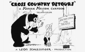 Cross-Country Detours (Warner, Merrie Melodies, 3/16/40 – Fred (Tex) Avery, dir.) – One of the best of Avery’s many spot-gag travelogue spoofs for the studio, featuring a variety of different types of gags. It is perhaps most remembered for its strip-tease rotoscope sequence of a lizard “shedding its skin” (even though this phenomenon of nature only occurs with snakes). Or for its split-screen imagery of something for the adults and something for the kiddies – a gila monster for the grown-ups, and a little girl reciting nursery rhymes for the tots. However, the little girl proves the more ferocious of the two, out-roaring the gila monster, causing him to run away in a panic. Beavers, however, are spotlighted in one sequence, constructing a dam. Before our very eyes, they built from concrete and mortar the mammoth Hoover Dam – then the best known and most modern hydroelectric dam in the nation. Avery would remember to use the structure as a prop again when he migrated to MGM, having his giant cat and mouse scramble over the top of it in King Size Canary.