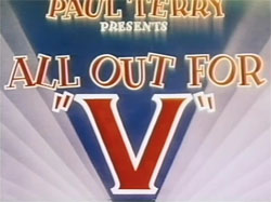 All Out For ‘V’ (Terrytoons/Fox, 8/7/42 – Mannie Davis, dir.) – An assortment of spot gags, as those in the animal community learn of the pronouncement of war declared from a newspaper extra. Among the first to react to the news are a population of beavers, who attack en masse a grove of trees in the wood, gnawing them within seconds into a bursting cloud of raining logs, which neatly stack into cabins in the newly-formed clearing, providing headquarters space for the War Production Office. The beavers later fell a tree with a shout of “Timber!”, while a woodpecker hammers a large tack into the sawed-off end of the log, a “caterpillar” tractor lassos the nail and tows the whole trunk away, and a team of termites uses their devouring power to cut the log into wooden boards. In a year when every studio got an automatic chance for an Oscar nomination, this film was under vote for the award – not that it had a chance of winning against Donald Duck’s “Der Fuehrer’s Face.”